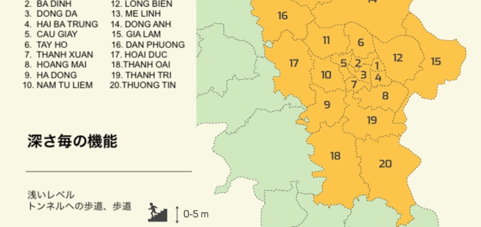 2030年までに地下空間が計画されており、2050年までのビジョンには、ホアンキエム、バディン、ドンダ、ハイバチュン、カウザイ、タイホ、タインスアン、ホアンマイ、ハドン、ナムトゥリエム、バクトゥリエム 、メーリン、ドンアン、ジアラム、ダンフォン、ホァイドゥク、タンオァイ、タンチ、トゥンティンが含まれる。